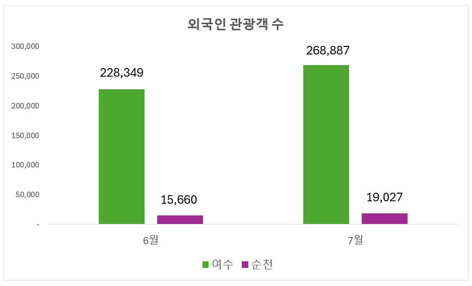 인접 도시인 여수시와 비교하면 더욱 보잘것없다. 여수를 찾은 외국인 관광객은 6월 22만8,369명이고 7월 26만8,887명이다. 순천시보다 각각 15배, 14배 많다. 지난해 같은 기간에 비해 증가한 관광객 수도 여수와 비교가 안 된다. 6월 증가한 외국인 관광객은 순천은 12,817명이지만 여수는 50,298명이다. 7월에도 순천은 13,787명 증가했지만 여수는 85,917명 증가했다.