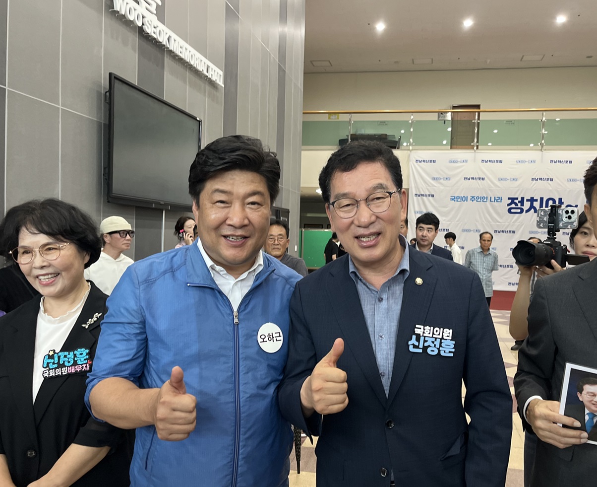 전남혁신포럼 출범식에 참석한 오하근 전 민주당 순천시장 후보와 신정훈 의원 사진=조성진 기자