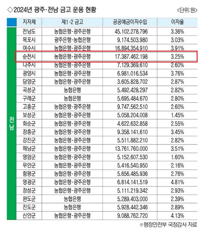더불어민주당 한병도 의원이 지난 2일 공개한 전국 243개 지자체 금고 운영자료에 따르면, 지난해 순천시의 공공예금 이자수입은 173.9억 원으로 평균 이자율은 3.25%였다. 장학기금 이자율 2.9~3%는 순천시 평균 이자율에도 미치지 못한다. 한병도 의원이 공개한 자료에 따르면 여수시 이자율은 3.91%이고 광양시는 3.76%로 순천시보다 높았다. 전남에서 가장 높은 지자체는 영광군으로 4.81%였다.