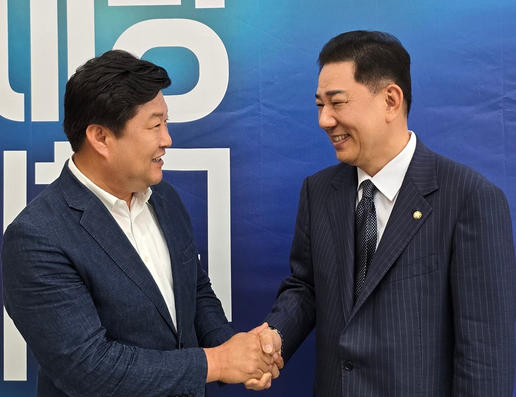 오하근 전 더불어민주당 순천시장 후보(왼쪽)와 김병기 원내대표