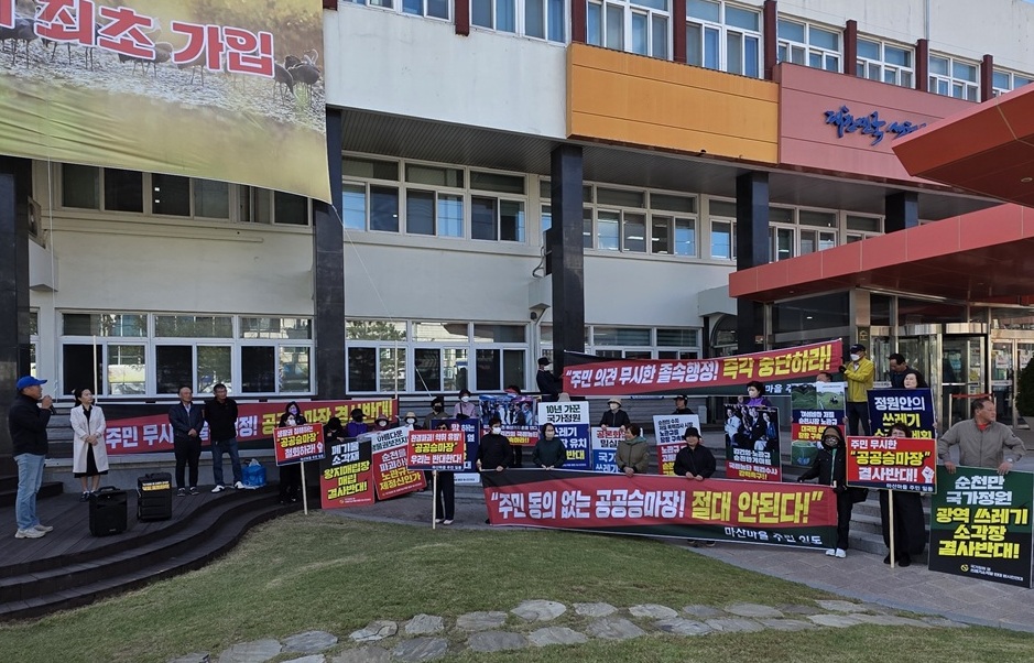 해룡면 마산마을 주민 30여 명은 27일 오전 순천시청 앞에서 기자회견을 열고 "생태의 상징 순천만국가정원 옆에 법적 다툼이 진행 중인 소각장에 이어 악취와 먼지가 발생하는 승마장까지 건립하는 것은 시민의 건강과 삶의 터전을 무너뜨리는 이중 삼중의 환경파괴"라고 주장했다.