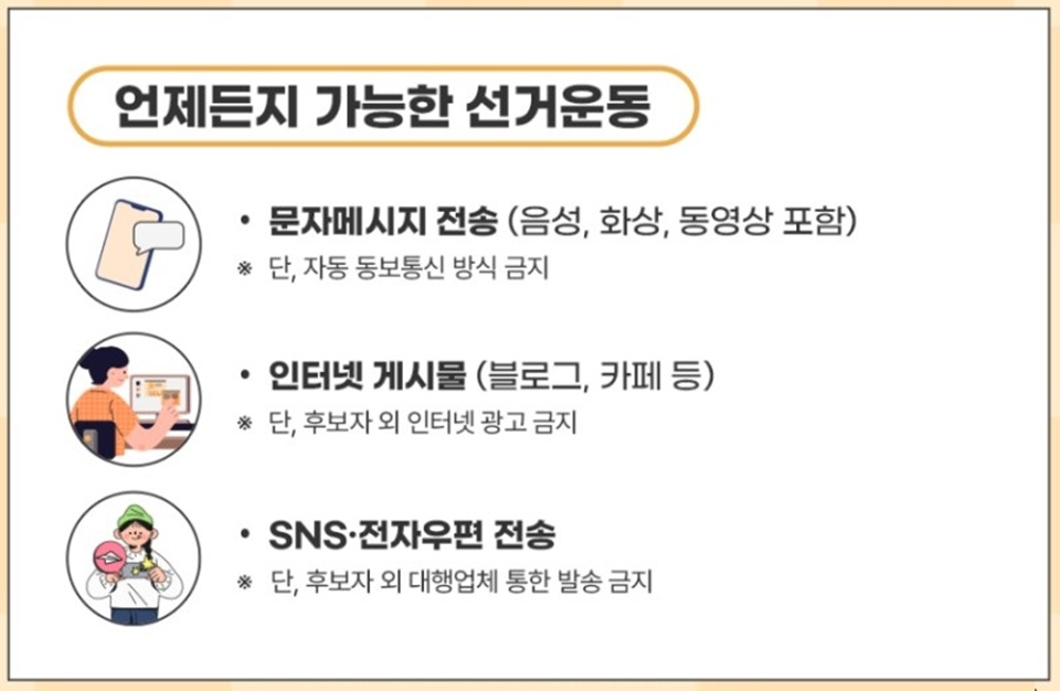 특히 자동 동보통신을 제외한 문자메시지 전송이나 블로그, 카페 등 인터넷 게시물은 선거당일에도 할 수 있는 선거운동으로 인정할 정도로 SNS를 통한 선거운동에는 관대한 편이다.