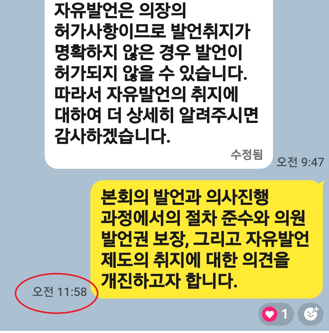 서선란 의원은 자유발언 취지 보완내용을 본회의 전날 오전에 카톡으로 전달했다. 출처=서선란의원 카톡