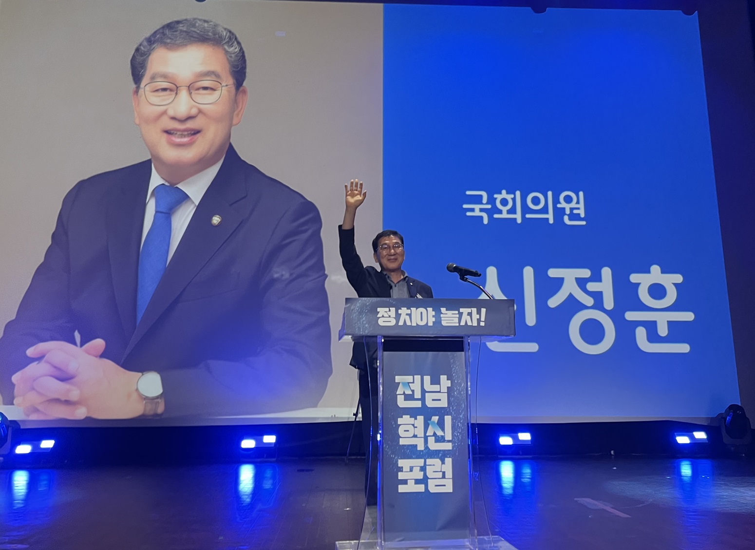 신정훈 국회의원이 참석자들의 환호에 화답하고 있다. 사진=조성진 기자