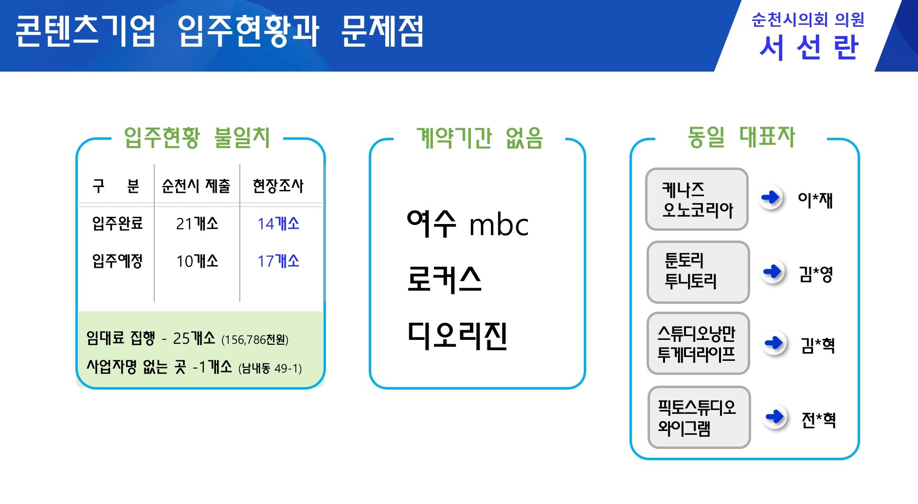 서선란 순천시의회 의원이 콘텐츠기업 입주현황과 문제점을 지적했다. 자료=서선란의원