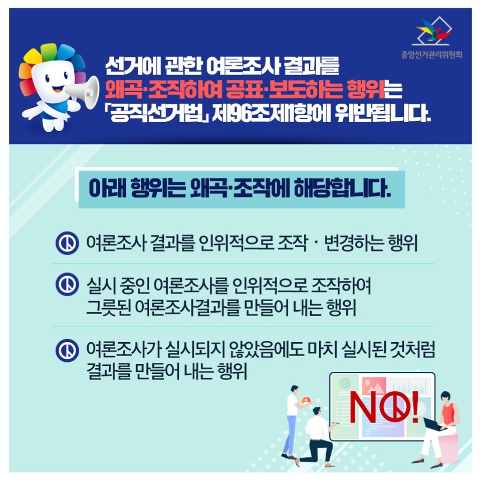 중앙선거관리위원회는 ‘여론조사 결과 왜곡·조작’이란 조사 결과를 인위적으로 변경하거나, 진행 중인 여론조사를 조작해 잘못된 결과를 만들어내는 행위라고 설명한다.