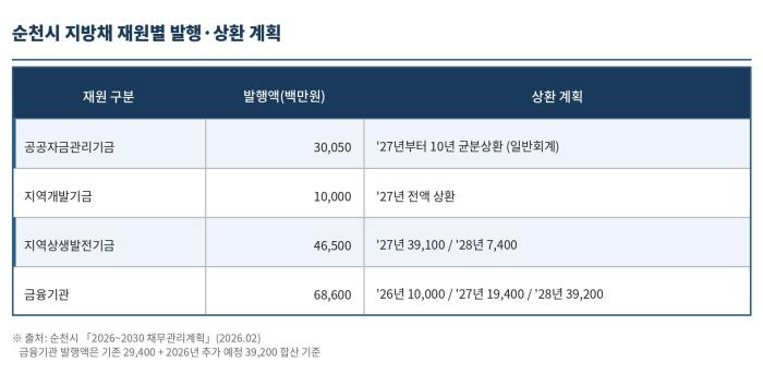 지난 2월 순천시가 공개한 「2026~2030 채무관리계획」에는 도시 재정의 급격한 변화가 담겨 있다. 2025년 한 해에만 859억원의 지방채가 새로 발행됐다. 명목은 '연향들 도시개발사업'이다.