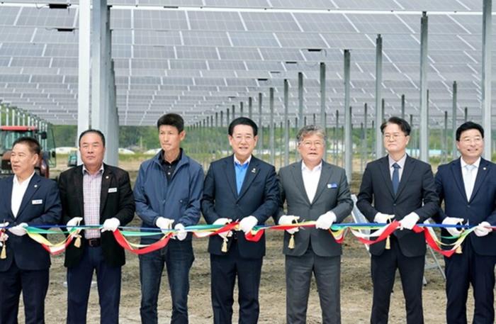 | 작년 5월 8일 월평마을 영농형 태양광 1단계 준공식이 열렸다. 가운데 김영록 전남도지사. 사진=전남도청 |