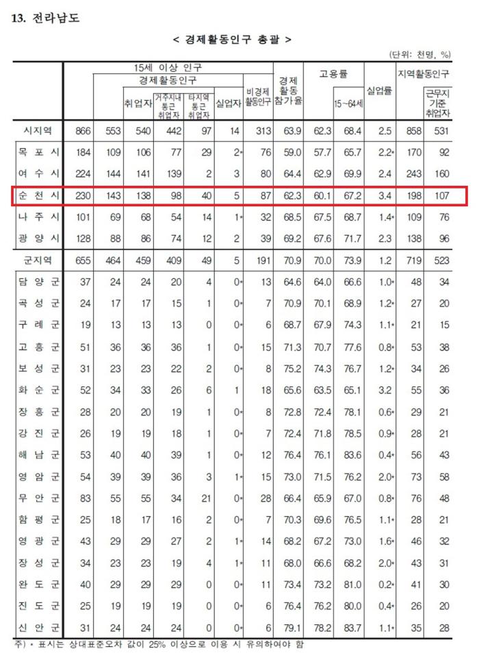 [동부뉴스=조성진 기자] 순천시 실업률이 2025년 하반기 기준 3.4%로 전남의 22개 시·군 가운에 가장 높은 수치를 기록했다. 국가데이터처(구 통계청)가 24일 발표한 '2025년 하반기 지역별고용조사 시군구 주요고용지표'에 따르면 순천시 실업률은 전남 최고이자, 전국 9개 도의 77개 시 평균인 2.9%를 0.5%포인트 웃돌았다. 같은 조사에서 지역활동인구 비중도 86.4%로 77개 시 평균인 96.8%에 크게 못 미쳐, 고용 경쟁력 전반이 약한 것으로 나타났다.