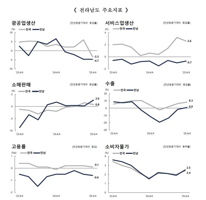 전남 경제는 고용률과 소비, 건설 부문에서 일정 수준을 유지하고 있으나, 생산과 수출에서 전국 평균을 밑돌고 있다. 특히 화학·금속 등 주력 산업의 둔화와 전문·과학·기술 서비스업 위축은 구조적 전환의 필요성을 시사한다. 첨단 제조업과 고부가가치 산업이 성장세를 이끈 충북·경기·광주와 달리, 전남은 중후장대 산업 의존 구조에서 벗어나지 못한 모습이다.