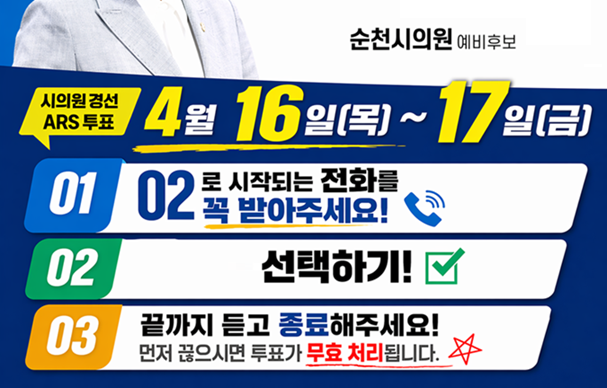 투표 안내 문자는 경선 하루 전날인 15일 발송되며 이때 ARS 전화번호도 같이 알려준다. 전화번호는 02로 시작된다. 자신의 휴대폰에 '순천시의원 경선전화'란 이름으로 전화번호를 저장해두면 잊지 않고 받을 수 있다.